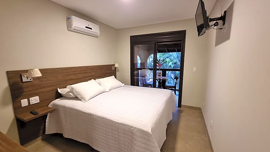 This double room has a flat-screen TV, fridge and desk.